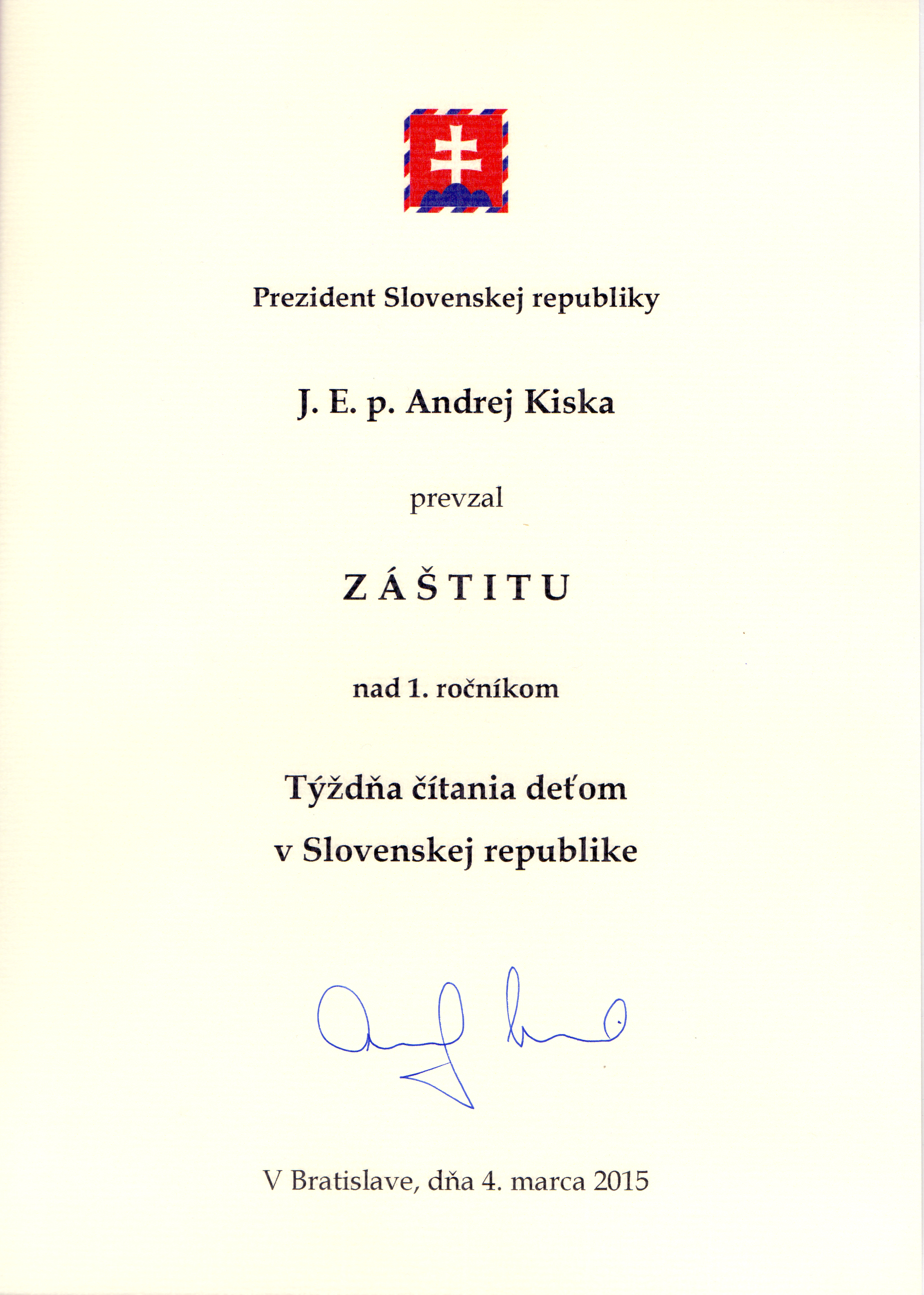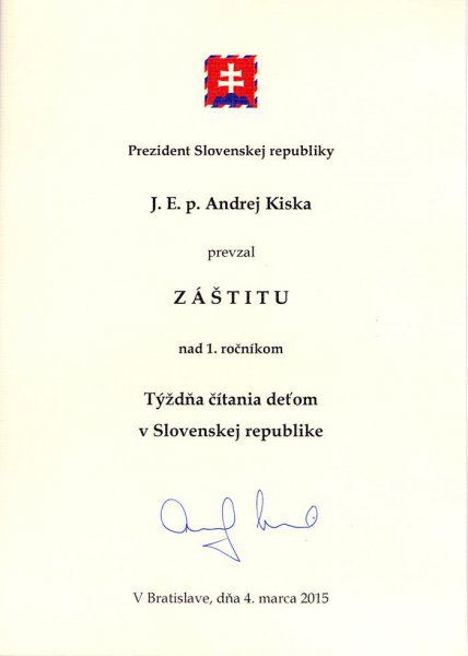 V roku 2015 prevzal záštitu nad 1.TÝŽDŇOM ČÍTANIA DEŤOM V SLOVENSKEJ REPUBLIKE prezident Slovenskej Republiky J. E. p. Andrej Kiska.