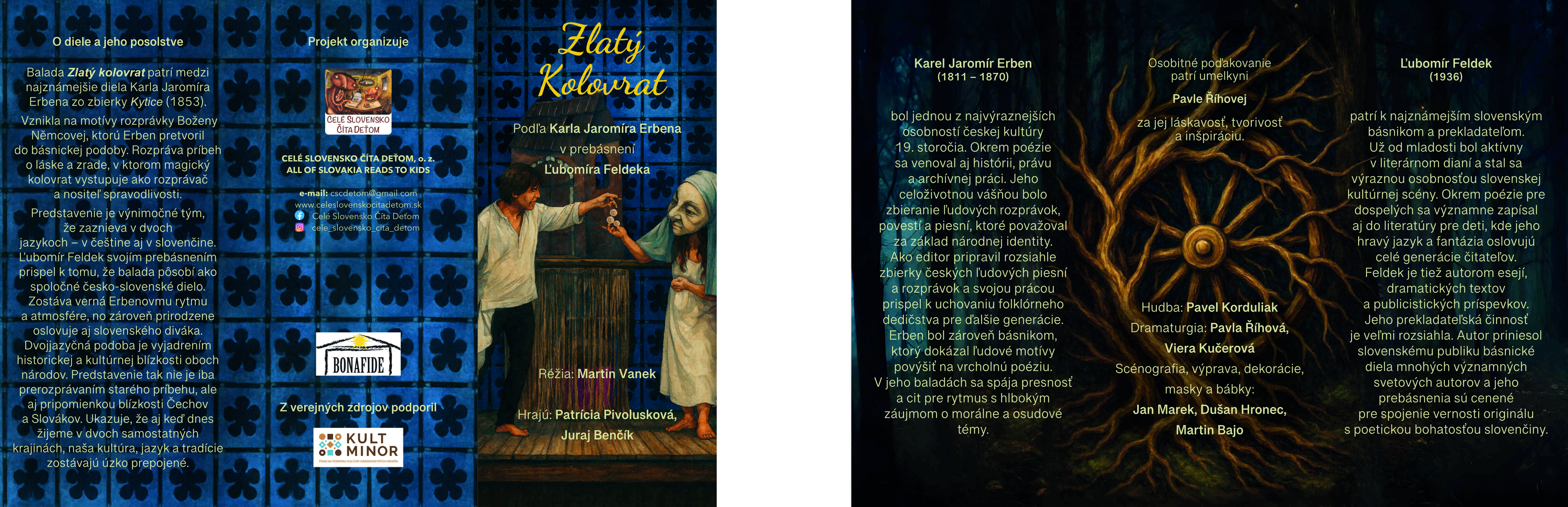 Pripravili sme bilingválnu česko-slovenskú inscenáciu, ktorá oživuje pôvodnú baladu Karla Jaromíra Erbena. Texty zaznejú v češtine aj v slovenskom prebásnení Ľubomíra Feldeka. Inscenácia je vhodná pre študentov od 10 rokov a môže slúžiť ako zaujímavý doplnok vyučovania literatúry, a tiež pripomenutie sedemdesiat rokov spolužitia bratských národov Čechov a Slovákov.