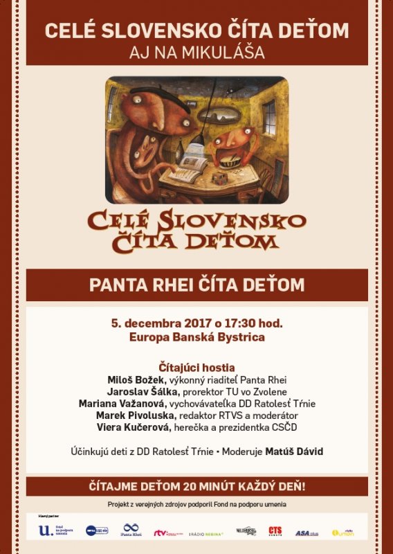 5. 12. 2017 zavítalo o.z. CSČD v podvečerných hodinách do kníhkupectva Panta Rhei v nákupnom centre EUROPA v Banskej Bystrici. Čítali sme detičkám z DD Ratolesť v Tŕní. Okrem krásneho vzájomného stretnutia čítajúcich hostí a detí, si Detský domov Ratolesť v Tŕní si v rámci mikulášskej zbierky Panta Rhei odniesol vyše 100 kníh. Čítajúci hostia dali prítomným deťom darčeky v podobe krásnych prečítaných príbehov a deti odmenili čítajúcich a organizátorov krásnym kultúrnym programom, ktorý si pripravili v podobe kolied, hudobných čísiel a tanca. Milé stretnutie s úžasnými hosťami a deťmi v adventnom čase medzi krásnymi knihami.
