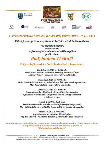 Prvý júnový týždeň prebiehal v Kysuckej knižnici v Čadci, ktorej zriaďovateľom je Žilinský samosprávny kraj, v znamení hlasného čítania deťom v rámci celoslovenského projektu „Celé Slovensko číta deťom“. Na podnet výzvy „Poď, budem ti čítať“ sa v knižnici stretávali deti, rodičia i učitelia, aby si vypočuli obľúbené rozprávky významných osobností mesta a regiónu. Okrem čítania sa besedovalo, hralo, spievalo, kreslilo a maľovalo, pretože čítanie je zábavné i poučné, obohacuje duševný svet, inšpiruje, podnecuje fantáziu a tvorivosť, je nenahraditeľným zdrojom poznania, ale i vzájomnej spolupatričnosti a rodinnej pohody.