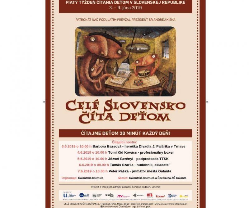 Galantská knižnica sa tento rok prvý krát zapojila do celoslovenského projektu Celé Slovensko číta deťom. V týždni od 3. – 7. júna 2019 budú i v Galante čítať významné osobnosti mesta a regiónu deťom zo svojej milovanej detskej knihy. Podujatie, ktoré sa koná pod záštitou prezidenta republiky Andreja Kisku, sa bude niesť v znamení hesla „Poď, budem ti čítať“ a bude akceptovať myšlienku „Čítajme deťom 20 minút každý deň!“. V tomto týždni budú v Galante deťom čítať v Galantskej knižnici a v Špeciálnej základnej škole títo hostia: Barbora Bazsová – herečka divadla J. Palárika v Trnave, Tomi Kid Kovács – profesionálny boxer, József Berényi – podpredseda TTSK, Tamás Szarka – hudobník a skladateľ a Peter Paška – primátor mesta Galanta. Veríme, že podujatie umocní v učiteľoch, rodičoch a deťoch záujem o knihy a nadšenie z čítania.