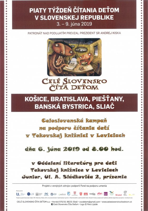 Tekovská knižnica v Leviciach sa zapojila do projektu Celé Slovensko číta deťom dňa 6. júna 2019. Od rána na oddelení literatúry pre deti vládla super čitateľská atmosféra, čítali knihovníčky, učiteľky, čitatelia, rodičia detí a samotní detskí čitatelia. Bolo nás spolu 50 účastníkov podujatia.