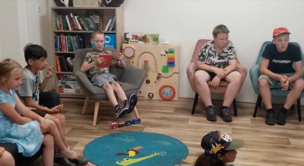 Vychovávateľka v ŠKD - Bc. Katarína Šmondrková a 11 detí z Centra pre deti a rodiny v Novej Bani.