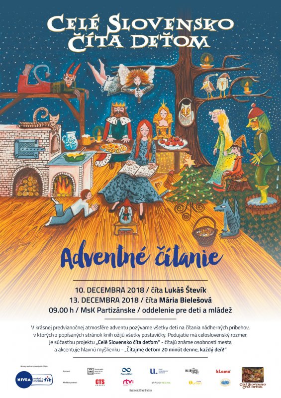V našej Mestskej knižnici v Partizánskom sme čítali deťom dvakrát, a to 10.12 a 13.12 2018. Prvému kolektívu detí čítal moderátor a pedagóg Lukáš Števík z knihy Vianočné mystérium od Josteina Gaardera. Druhému kolektívu čítala moderátorka a poslankyňa mesta Partizánske Mária Bielešová z knihy Rozprávky pod stromčekom od Zbyňka Malinského. Po čítaní sme s deťmi vyrábali originálne vianočné pohľadnice pre seniorov z neďalekého domova dôchodcov.