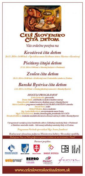 Vo štvrtok 27.11. 2014 sme sa presunuli o takmer 200 km, 9:00 hod., Mestská knižnica v Piešťanoch a CELÉ SLOVENSKO ČÍTA DEŤOM už po tretí krát sme čítali v tomto meste. Hostia fantastickí, deti rovnako a tak sme strávili krásnu hodinu čítaním, rozprávaním, hraním, dobre nám bolo, snáď všetkým.