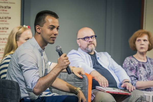 Piešťanských školákov privítal moderátor Matúš Dávid, prezidentka občianskeho združenia Celé Slovensko číta deťom Viera Kučerová i riaditeľka knižnice Margita Galová.