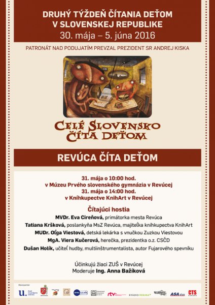 V Revúcej sa v utorok 31.mája 2016 v druhom týždni čítania deťom, čo znamená druhý ročník projektu na Slovensku, uskutočnili dve čítania. Dopoludnia sa čítalo v podkroví Múzea Prvého slovenského gymnázia pre žiakov druhého stupňa základných škôl. Čítania sa zhostila aj primátorka mesta Eva Cireňová s ukážkou z diela Úvod k vakáciám od Martina Kukučína. Humorným príbehom spisovateľky Marty Hlušíkovej z knihy Neznášam keď ma hladkajú po hlave, deti zaujala majiteľka kníhkupectva a poslankyňa mestského zastupiteľstva Tatiana Kršková . Čítaním Slncového koňa od Ľuda Zelienku a hrou na fujare upútal pozornosť Dušan Holík zo združenia Duša fujary. Záver patril Turčínovi Poničanovi od Sama Chalupku v podaní Viery Kučerovej. Čítané slovo dopĺňala hudba v podaní žiakov základnej umeleckej školy.