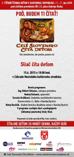 Krásne pondelkové dopoludnie 15.6. 2015 o 10:00, v rovnako krásnej záhrade Mestského kultúrneho strediska Sliač, pretože Sliač čítal deťom, nestihli sme v rámci 1.TÝŽDŇA ČÍTANIA DEŤOM V SR, ale v mesiaci jún áno. Úžasní čítajúci i hrajúci hostia a skvelé deti, veď fotky hovoria za všetko.