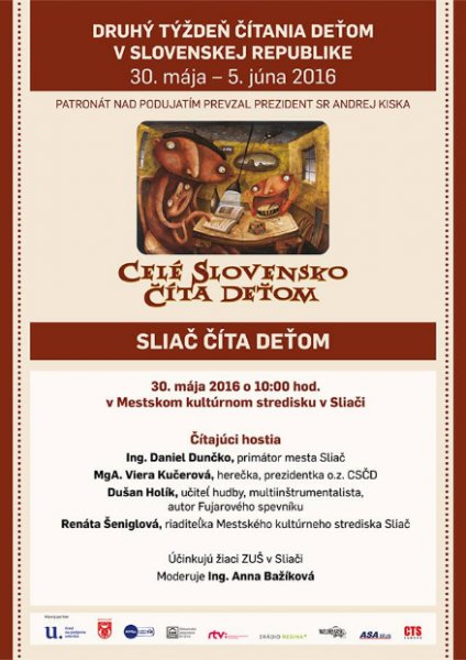 30. mája 2016 sme odštartovali v Mestskom kultúrnom stredisku v Sliači DRUHÝ ROČNÍK ČÍTANIA DEŤOM V SR, ktorého organizátorom je o.z. CELÉ SLOVENSKO ČÍTA DEŤOM.