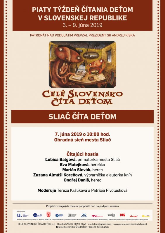 V piatok 7. júna sme čítali v Obradnej sieni mesta Sliač. Medzi deti prišla pani primátorka Ľubica Balgová i autorka kníh Zuzana Almáši Koreňová. Herečka Eva Matejková s manželom Mariánom Slovákom zaspomínali na na svoje detsvo a porozprávali, aké sú knihy pre nich v živote dôležité. Ondřej Daniš prečítal úryvok z knihy Mach a Šebestová, ktorú najradšej číta svojim deťom a pútavé čítanie ukončil spevom. Zaspievala aj Terezka Králiková a spolu s Patríciou Pivoluskovou celý program moderovali.