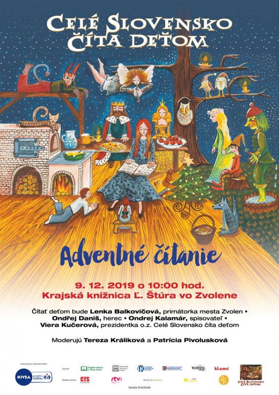 9. decembra 2019 sme zrealizovali prvé „Adventné čítanie“ v Krajskej knižnici Ľ. Štúra vo Zvolene. Vo sviatočnej atmosfére deti zaujato počúvali nielen príbehy z kníh, ale aj rozprávanie o vzťahu ku knihám a k životným hodnotám. Čítať deťom prišla pani primátorka mesta Zvolen Lenka Balkovičová, ktorá v tomto roku získala ocenenie primátor roka, herec Ondřej Daniš i spisovateľ Ondrej Kalamár. Čítanie prinieslo i rozmery, ktoré v nás zanechali nezabudnuteľné dojmy. Programom sprevádzali Patrícia Pivolusková a Tereza Králiková, ktorá aj zaspievala vianočné koledy.