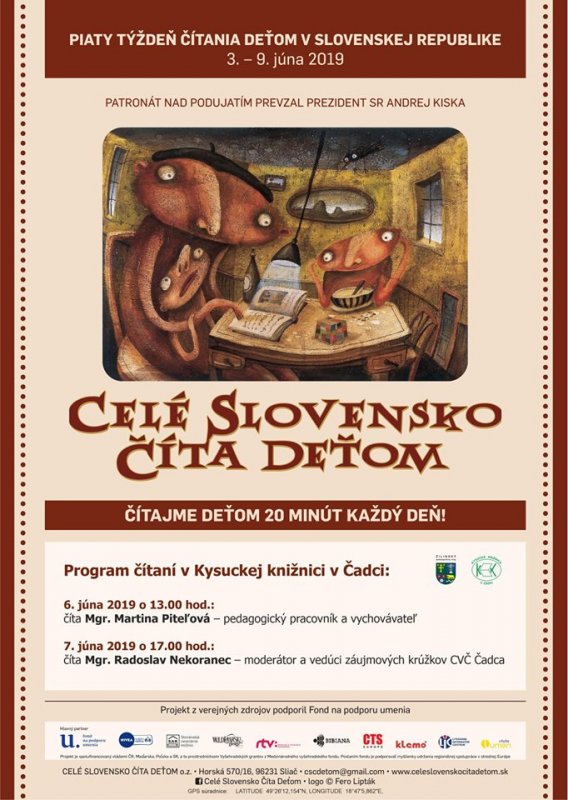 Kysucká knižnica v Čadci v zriaďovateľskej pôsobnosti Žilinského samosprávneho kraja opäť nadšene otvorila svoju náruč krásnym podujatiam na podporu čítania. Prelom mesiacov máj a jún sa tradične teší veľkým čitateľským aktivitám po celom Slovensku. V dňoch 3. až 9. júna 2019 sa uskutočnili čítania dospelých deťom pod názvom Celé Slovensko číta deťom. Piaty týždeň čítania deťom v Slovenskej republike. Aktivita akcentuje myšlienku „Čítajme deťom 20 minút denne“. Patronát nad podujatím prevzal prezident SR Andrej Kiska.