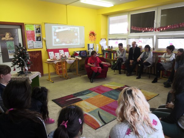 Dňa 17. 12 sa konalo posledné stretnutie adventného čítania, ktorého hosťom bola Ingrid Hrnčárová, ktorá pracuje na OÚ v Nitre na odbore školstva. Žiakom priniesla krásny dar – vianočnú ružu. Prečítala im z knihy „Bruno Ferrero – Vianočné príbehy“ – príbeh o vianočnej ruži. Potom ešte deti predniesli básničky a spoločne si zaspievali.