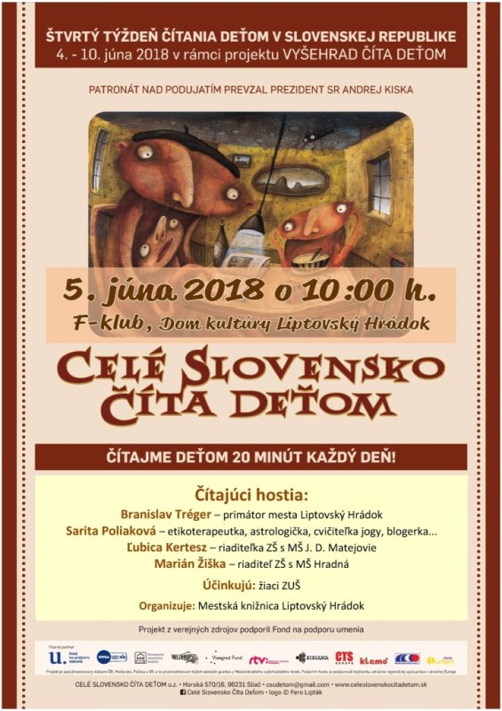 V rámci podujatia čítajú deťom významné osobnosti mesta alebo regiónu zo svojej obľúbenej detskej knihy. My sme na čítanie pozvali primátora mesta Liptovský Hrádok pána Branislava Trégera, etikoterapeutku, astrologičku, bývalú redaktorku, blogerku, bývalú učiteľku, pani Saritu Poliakovú, riaditeľku Základnej školy J. D. Matejovie pani Ľubicu Kertesz a riaditeľa Základnej školy na ul. Hradnej pána Mariána Žišku. Čítanie nám hrou na klavíri spestrili dievčatá zo Základnej umeleckej školy, ktoré pripravila pani učiteľka Zlatka Jurišová.
