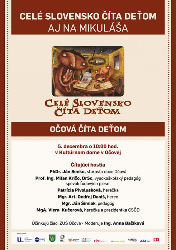 5. decembra sme začali rozdávať darčeky v podobe našich čítaní "CELÉ SLOVENSKO ČÍTA DEŤOM“. Prvé Mikulášske darčeky sme rozdali v malebnej obci OČOVÁ, ktorá sa pýši nielen krásnym rázovitým folklórom, ale aj významnými rodákmi medzi ktorých patrí Matej Bell Funtík, Pilárikovci či spisovateľ Ján Poničan. Prekvapila nás plná sála detí, od najmenších predškolákov až po budúcich stredoškolákov. Všetci počúvali rozprávanie čítajúcich hostí o ich vzťahu ku knihám i príbehy, ktoré im potom hostia čítali.